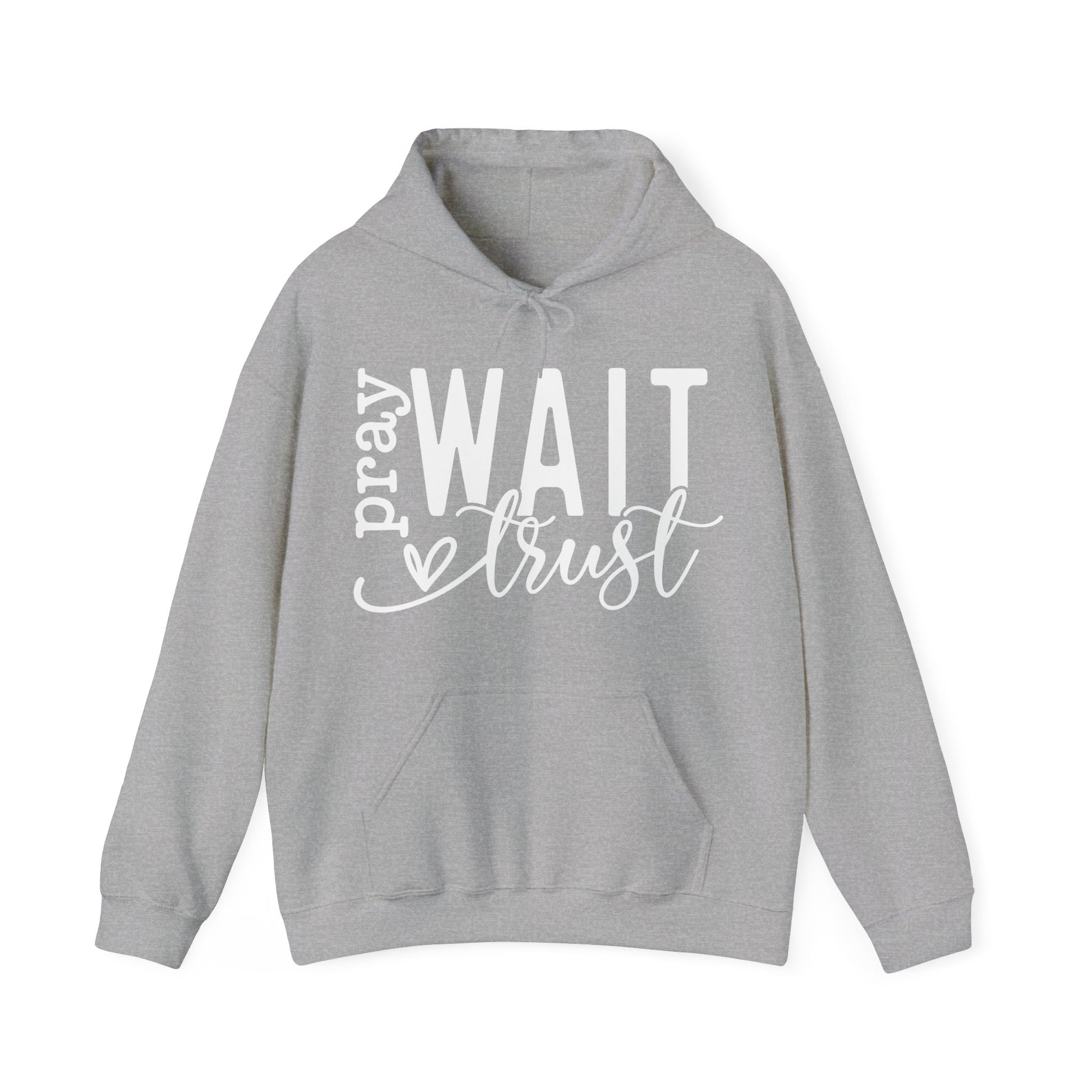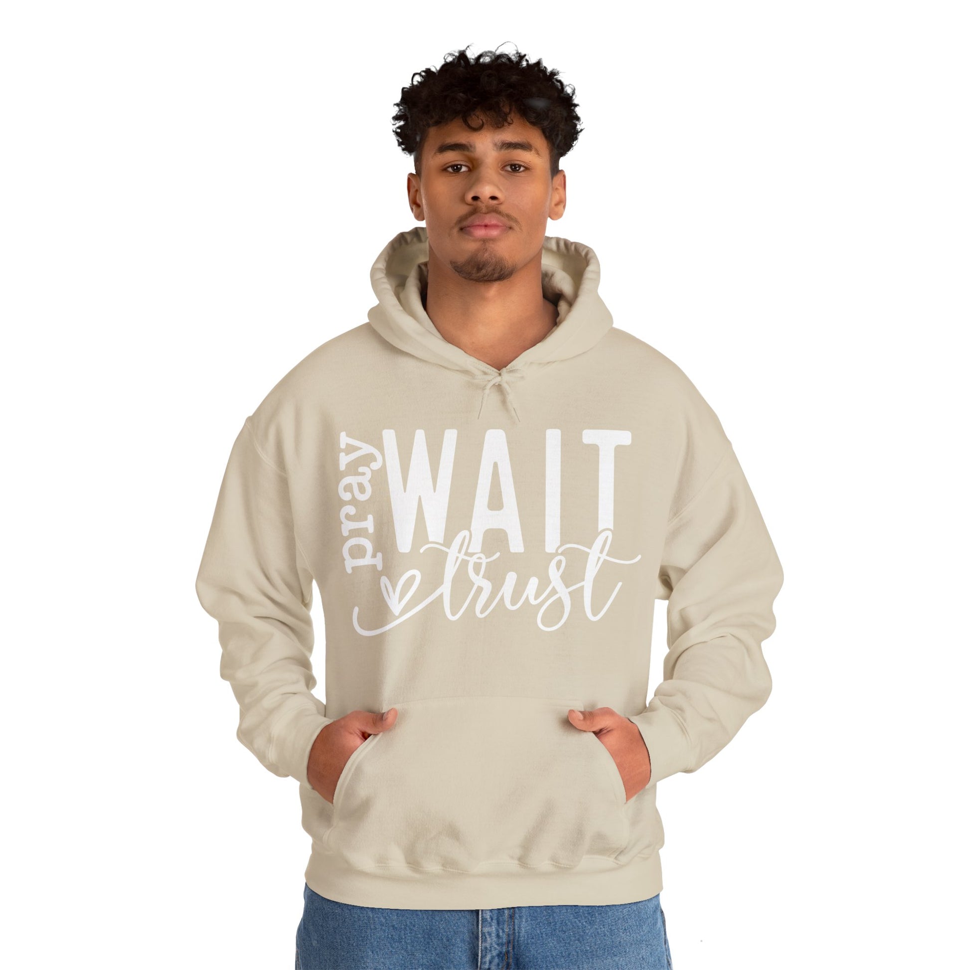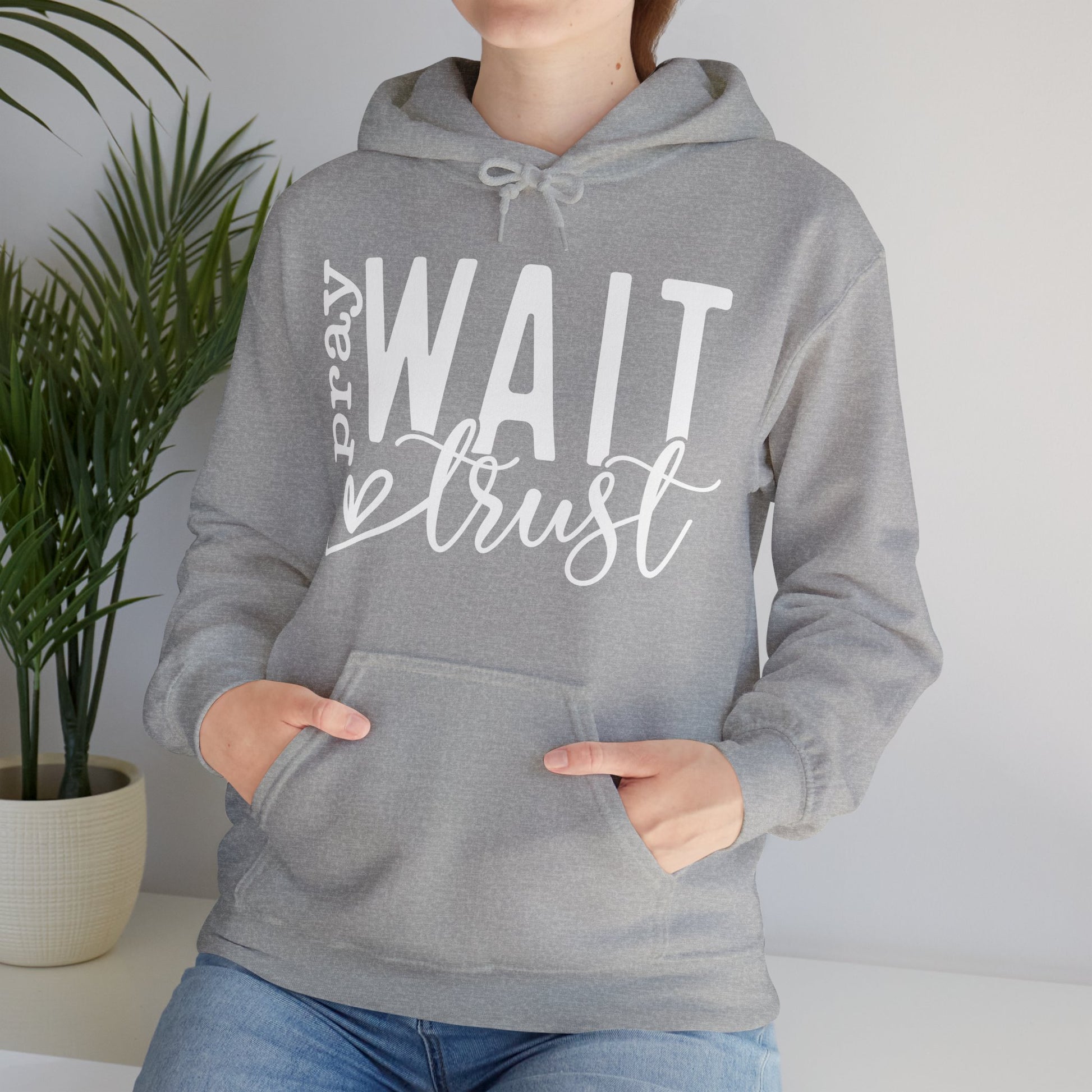 Crafted with meticulous care, this heavy blend hooded sweatshirt is relaxation itself. Made with a thick blend of cotton and polyester, it feels plush, soft, and warm, a perfect choice for any cold day or night. With its gentle allure and serene charm, the elegant design delicately showcases "Pray Wait Trust" across the chest, inviting a feeling of peace and elegance.